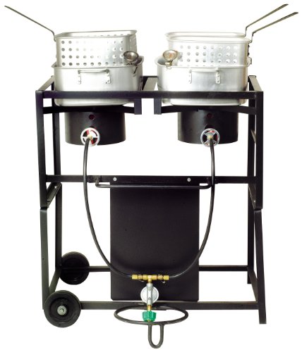 30-Inch Dual Outdoor Propane Frying Cart, 2-54,000 BTU Cast Burners, 1-Aluminum Rectangular Fry Pan with Single Basket and Heat Resistant Handle, 1-Rectangular Aluminum Fry Pan with Double Baskets and Heat Resistant Handles, Listed LP Hoses and Regulator with Type 1 Connection and Brass Needle Valves, 2- Deep Fry Thermometers, Instruction/Recipe Booklet. CSA Design Certified.Available at Amazon